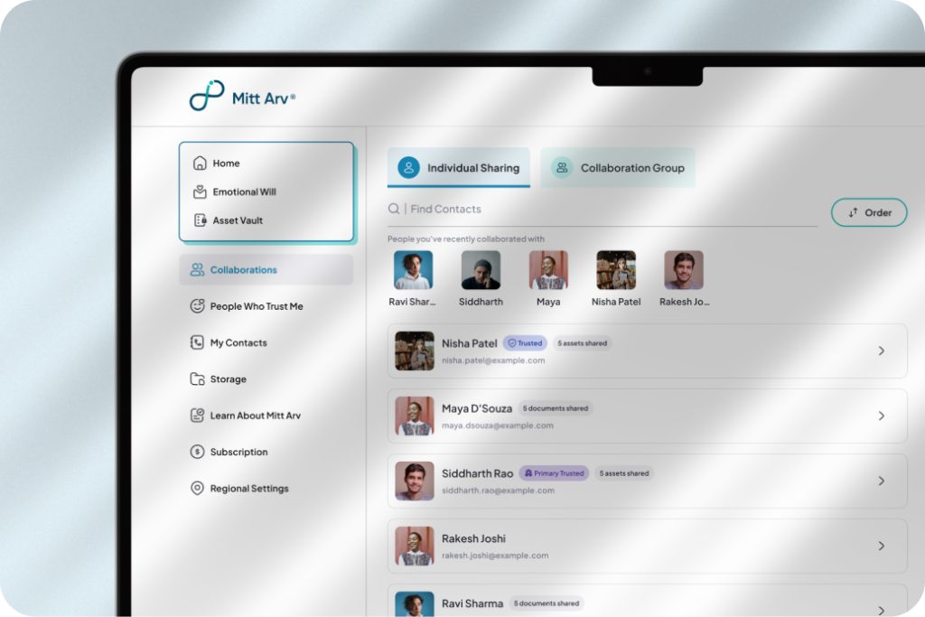 Mitt Arv’s Asset Vault lets you list and share all your financial and important information with your trusted ones at a time you choose.